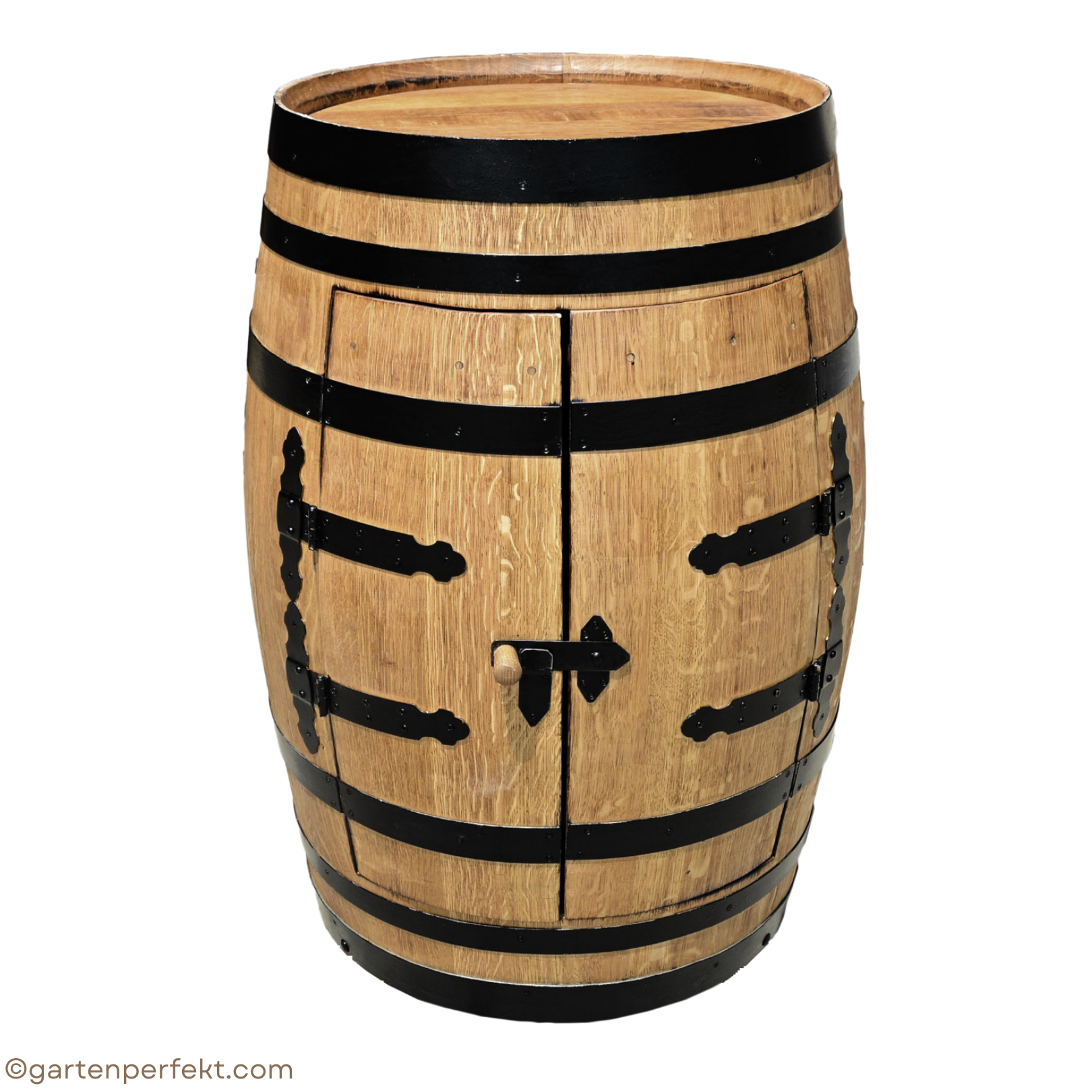 Die Fasskönigbar ist sofort einsatzbereit und überzeugt mit ihrem schwarzen Fassring und einem integrierten Fach hinter dem charmanten Türchen.
