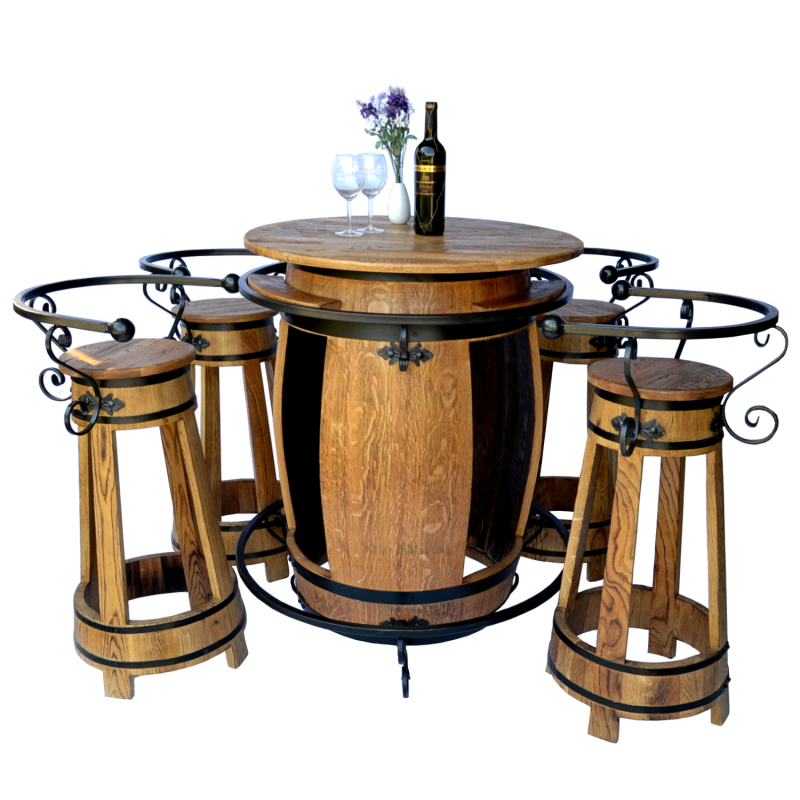 5-teilige Sitzgarnitur GRACIANO aus einem Eichen-Weinfass umfasst einen Stehtisch und vier Hocker mit handgeschmiedeten Zierelementen.